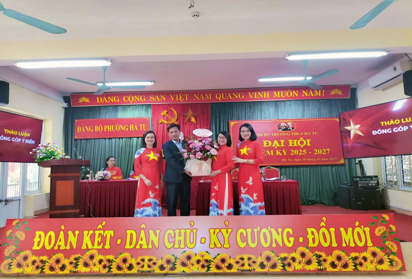 Đồng chí Phạm Tuấn Hiệp – Bí thư Đảng ủy phường Hà Tu (cũ) tặng hoa và chúc mừng Đạo hội Chi bộ