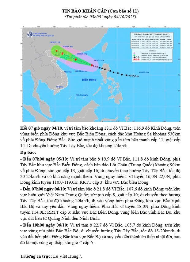 Chiều ngày 03/10/2025, bão MATMO đã di chuyển vào biển Đông trở thành cơn bão số 11, sức gió mạnh nhất vùng gần tâm bão mạnh cấp 10, giật cấp 13. Theo dự báo của Trung tâm dự báo khí tượng thủy văn quốc gia, bão số 11 sẽ tiếp tục mạnh thêm lên cấp 12-13, giật cấp 15-16, di chuyển nhanh về phía bán đảo Lôi Châu và khu vực Vịnh Bắc Bộ; trong ngày 05 - 07/10/2025, bão sẽ ảnh hưởng trực tiếp đến Vịnh Bắc Bộ, ven biển và đất liền nước ta, tiếp tục gây mưa lớn tại khu vực Bắc Bộ và Thanh Hóa, Nghệ An.