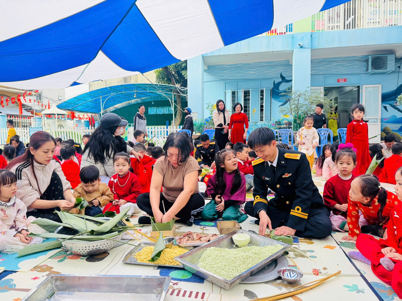 Không khí Tết rộn ràng lan tỏa khắp sân trường khi các khối Nhà trẻ, 3, 4, 5 tuổi cùng tham gia gói bánh chưng. Các bé phụ giúp những công đoạn đơn giản; cô giáo, phụ huynh và các chú bộ đội cùng chung tay gói, luộc bánh, giữ gìn nét đẹp Tết cổ truyền.