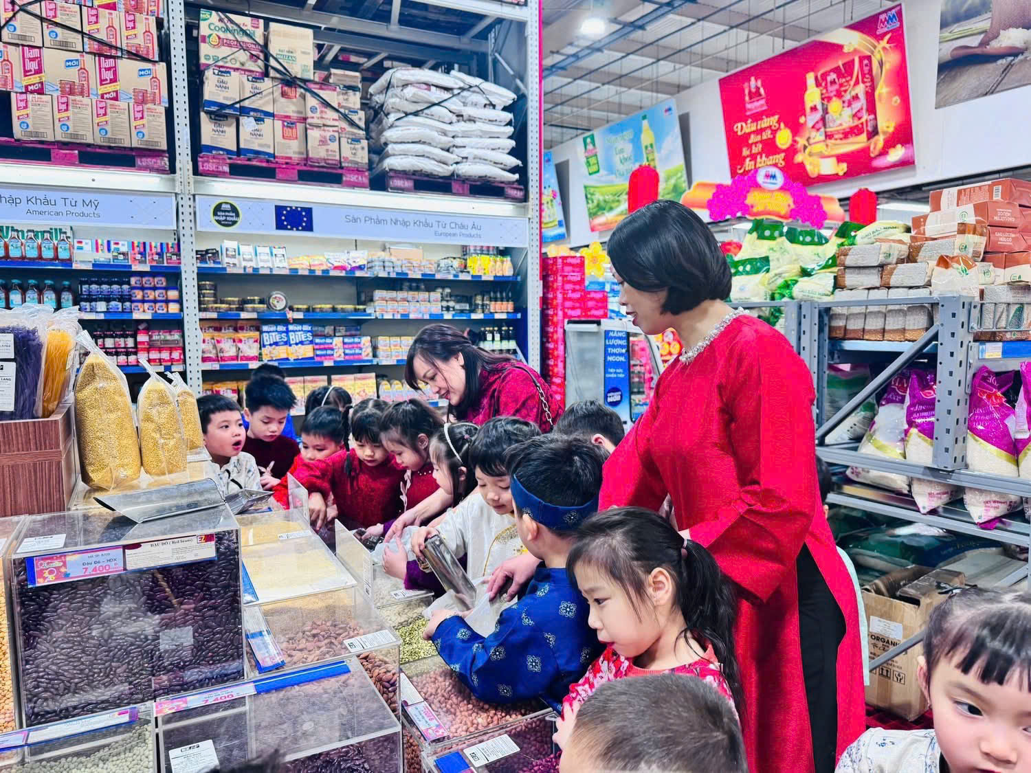 Trẻ khối 5 tuổi hào hứng tham quan Siêu thị Mega Market Hạ Long, thực hành kỹ năng đi siêu thị, lựa chọn và mua các nguyên liệu truyền thống như gạo nếp, đỗ xanh, lá dong, lạt buộc… chuẩn bị cho hội thi gói bánh chưng.
