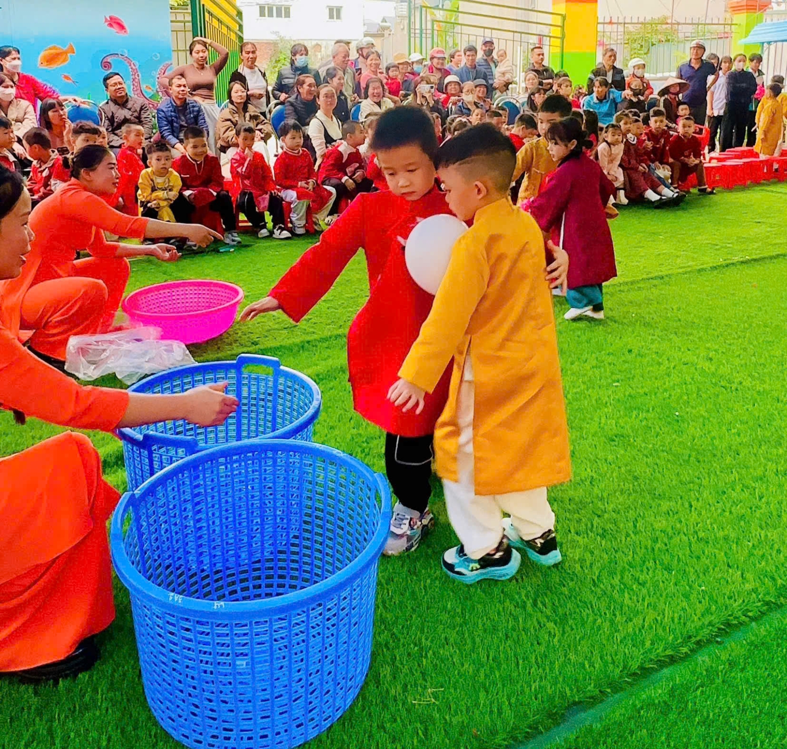Ngày hội dân gian được tổ chức cho trẻ khối 3, 4, 5 tuổi với nhiều nội dung hấp dẫn như: văn nghệ chào mừng của khối 5 tuổi, các trò chơi dân gian “Bịt mắt đập trống”, “Kẹp bóng tiếp sức”, “Kéo co vui xuân”.