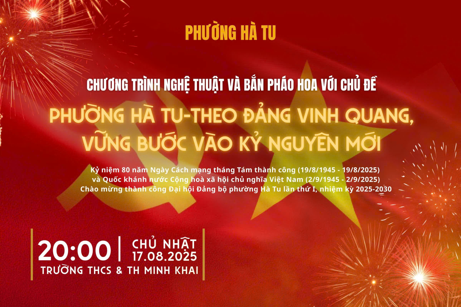 Thực hiện Kế hoạch số 38/KH-UBND ngày 07/8/2025 của UBND phường Hà Tu về việc tổ chức chương trình nghệ thuật kỷ niệm 80 năm Ngày Cách mạng tháng Tám thành công (19/8/1945 - 19/8/2025) và Quốc khánh Nước CHXHCN Việt Nam (02/9/1945 - 02/9/2025), chào mừng thành công Đại hội đại biểu Đảng bộ phường Hà Tu lần thứ I, nhiệm kỳ 2025 - 2030.